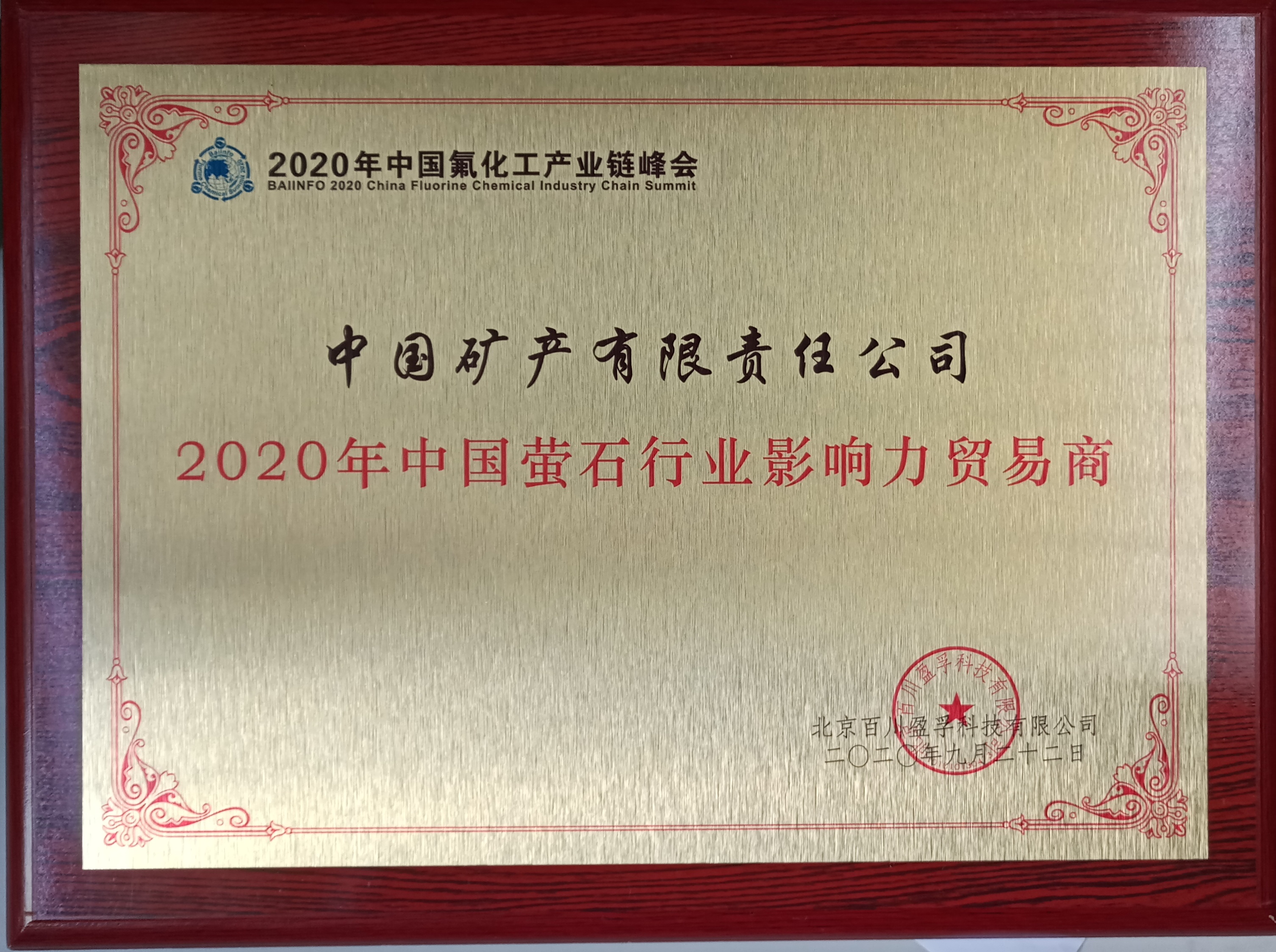 2020年9月中国矿产有限责任公司被首月2020年中国萤石行业影响力商业商